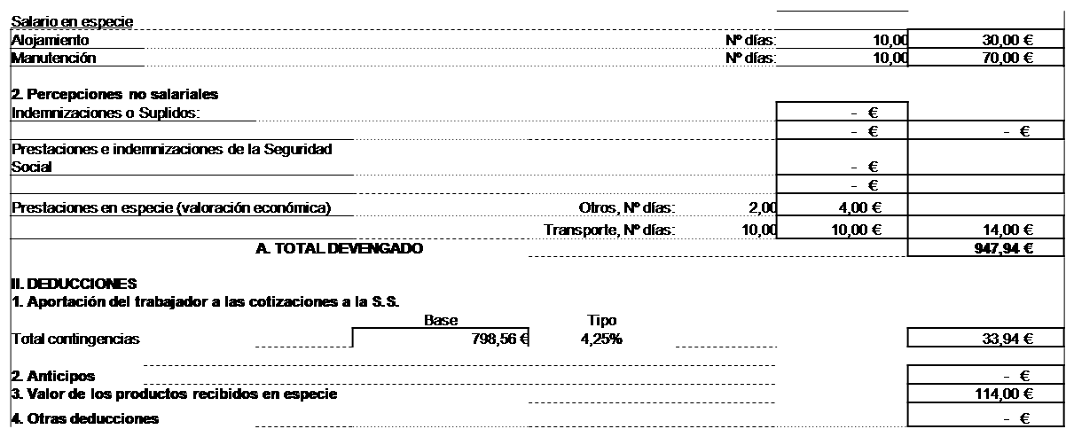 En el ejemplo que se muestra se supone que se efectúa una valoración del pago por 10 días de alojamiento a 3€/día y la manutención a 7€/día y el transporte a 1€/día y el pago de 2 días en concepto de "Otros" en general por valor de 2€/día. En total, la valoración de los pagos en especie será de 114€/mes y ese mismo importe se deducirá en la casilla correspondiente de "Valor de los productos recibidos en especie"